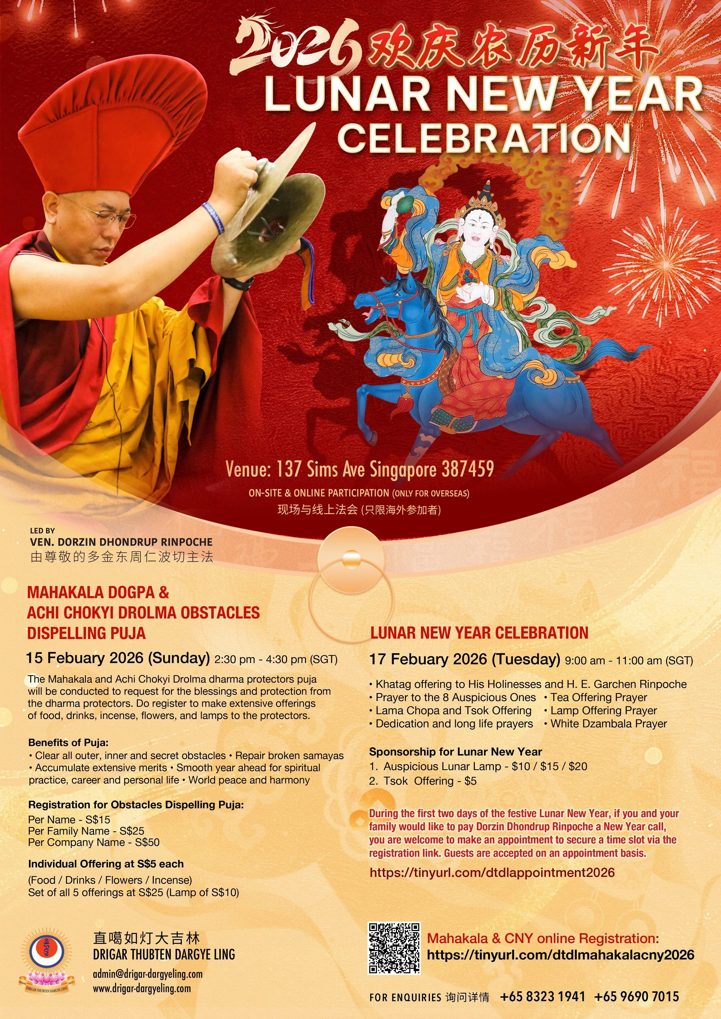 Drigar Thubten Dargye Ling is a Tibetan Buddhist centre of the Drikung Kagyu lineage, founded in Singapore by the highly revered H.E. Garchen Rinpoche in 2007.