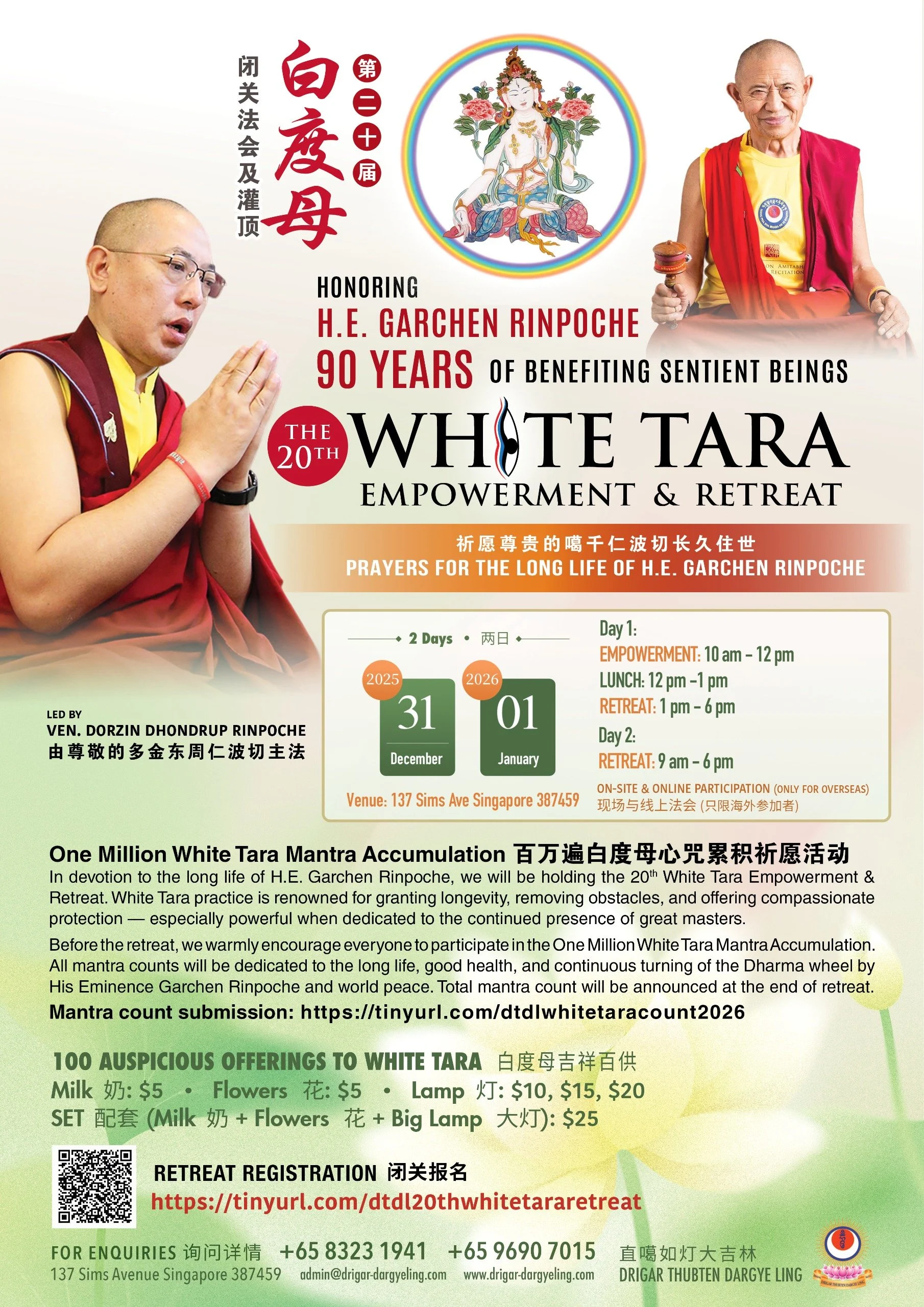 The 20th Two-Day White Tara Retreat is scheduled to take place on 31 December 2025 and 1 January 2026 at Drigar Thubten Dargye Ling. The empowerment and retreat will be guided by Ven. Dorzin Dhondrup Rinpoche .