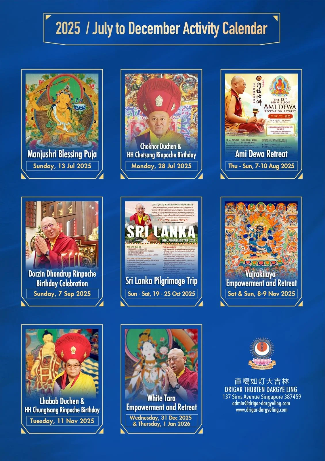 Major Programmes Half Year Calendar from July to December 2025DTDL will be holding a series of Dharma activities from July to December 2025, providing an opportunity for Dharma friends to come together and accumulate merits collectively. Annual Dharma Activites
