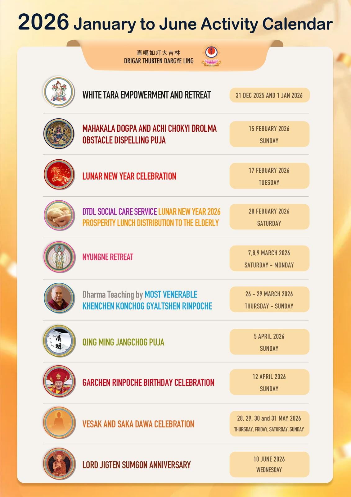 Major Programmes Half Year Calendar from January to February 2026DTDL will be holding a series of Dharma activities from January to February 2026, providing an opportunity for Dharma friends to come together and accumulate merits collectively. Annual Dharma Activites